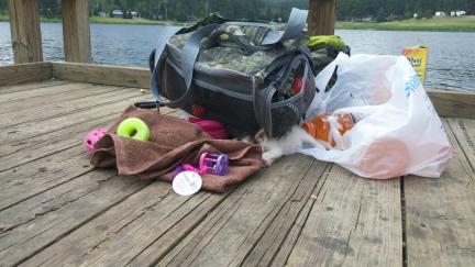 | calico kitty cat kitten sleeping on dock iron lake south dakota sd trick agility |